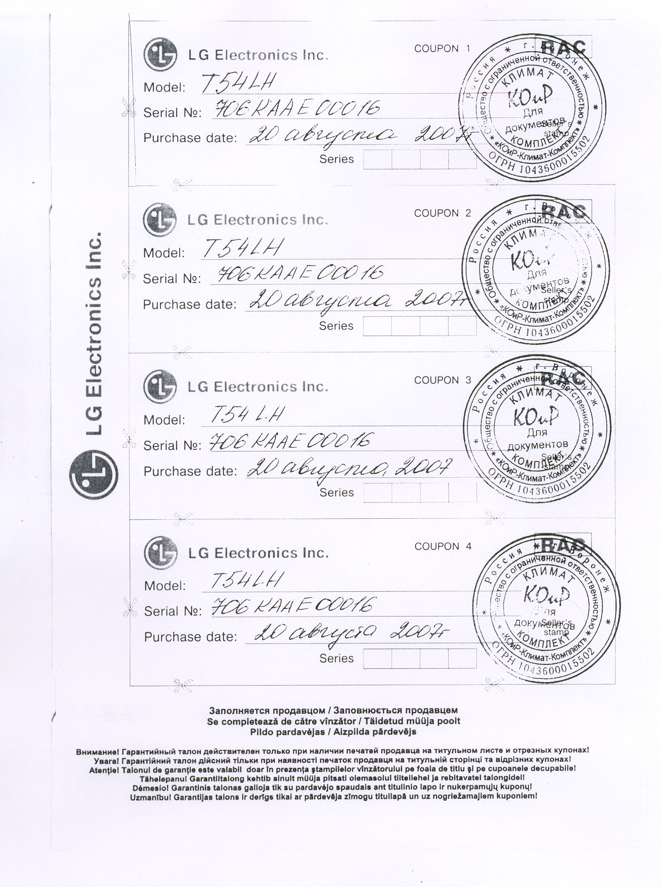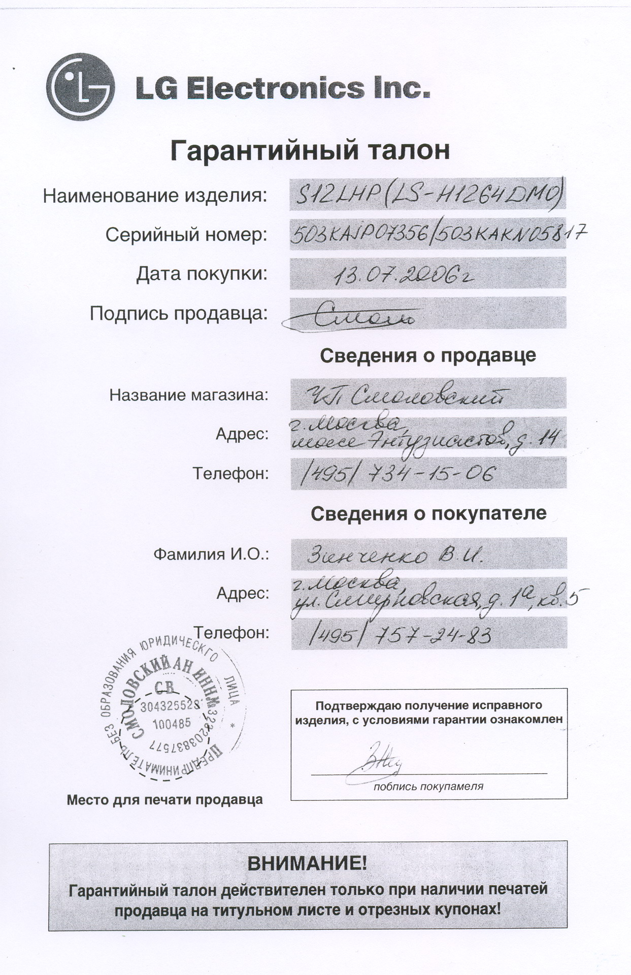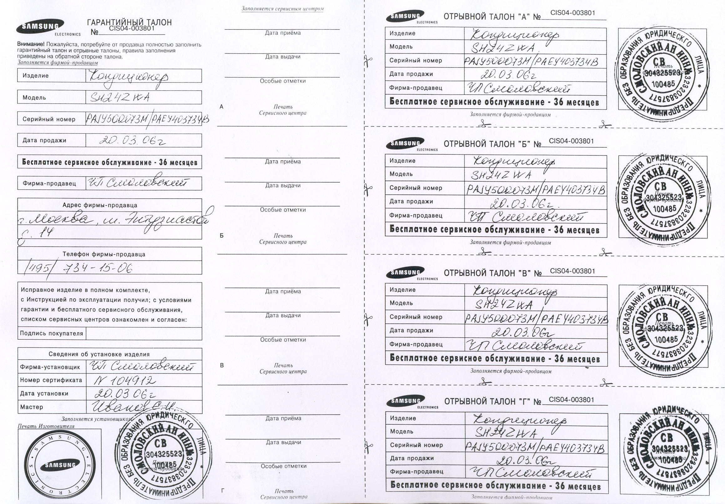 Уважаемые дилеры! Доводим до вашего сведения, что на гарантийном талоне должны стоять печати конечного продавца, т.е. ваши печати и должна присутствовать информация о конечном покупателе, т.е. о лице, которому вы продали аппарат.